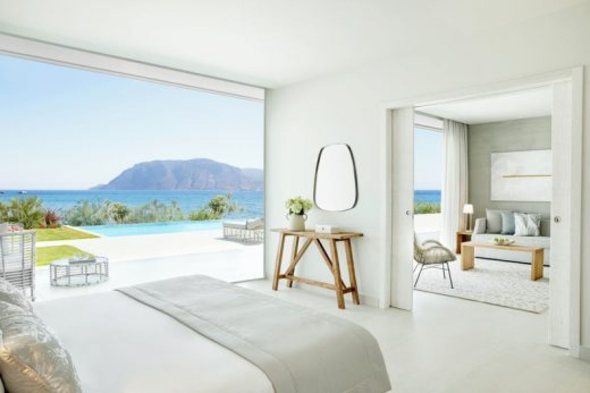 These ultra-spacious and elegant suites come with a separate bedroom and lounge for extra privacy. Panoramic windows and a private garden offer views over the beautiful Aegean. The perfect space for two adults and three children.